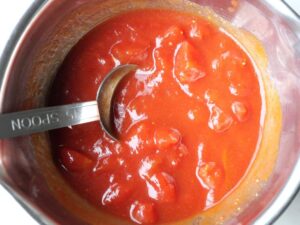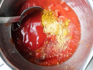 煮汁は、カットトマト缶、カレー粉、顆粒コンソメ、ケチャップ、みりん、醤油。