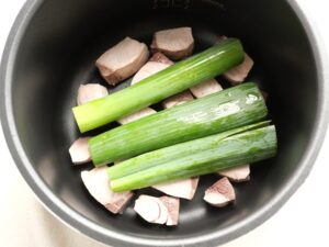 臭み消しに、長ねぎの青い部分を入れて、