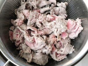 牛肉(切り落とし肉やこま切れ肉)は、食べやすいように一口大に切り、湯通しをしておきます。湯通しすると、余分な脂はもちろん、アクや臭みも取り除けるのだそう。