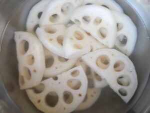 れんこんを切ったら、酢水にさらしてアク抜きと色止めをしておきましょう。